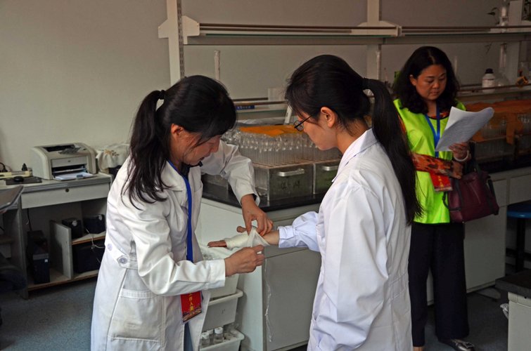 6月28日下午4点整,随着演练总指挥吕家珑一声令下,“西北农林科技大学伟德体育官网消防应急疏散演练活动开始!”学院消防演练活动拉开帷幕。16点02分,佟小刚老师报告,“413实验室有疑似火情,有明火及大量浓烟冒出”,指挥组立即调配学院应急救护队赶赴现场紧急施救,高峰等校卫队员也迅速到达413实验室进行支援,全力进行扑救。为保证安全,疏散组组长田长河通知各楼层负责人组织全楼师生疏散,并通过广播拉响警报,通报火情,指导师生用湿毛巾捂住口鼻,保持低姿沿楼梯靠墙一侧有序撤离。在撤离过程中,指挥组还接到了六楼东侧602实验室有人员受伤的求救信息,应急救护队员在收到指挥组命令后也立即开展救护工作,对伤员进行包扎和紧急处理,并转移至安全地带。
