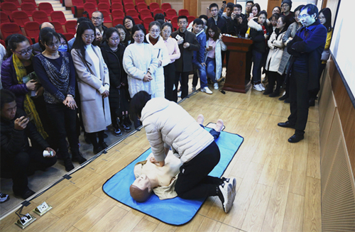王云峰老师、赵冉老师及王化明主任分别对以下七个部分进行了详细宣讲:第一,党和国家对于火灾问题高度重视;第二,已发生火灾案例触目惊心,仍历历在目;第三;火灾探源及危害,有效遏制火灾的发生;第四,介绍几类消防火险;第五,介绍如何进行高效消防管理;第六,关于消防器材使用的介绍;第七,要提升救灾能力,在这一部分,校医院王化明主任重点介绍的心脏复苏的相关事项,并在现场进行了教学,多名师生进行模拟试验。最后,几位老师尤其强调火灾安全知识由理论转化至实践操作的重要性。