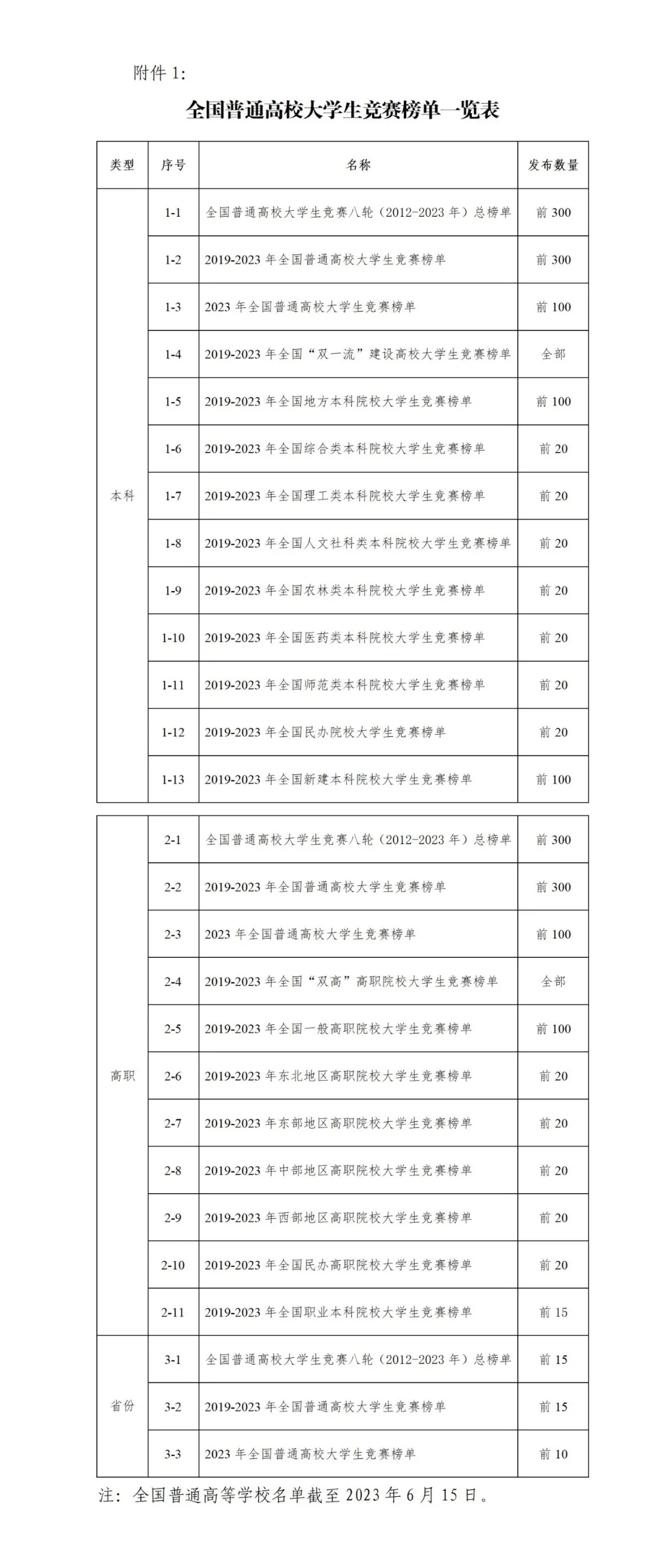 2024年3月22日,中国高等教育学会高校竞赛评估与管理体系研究专家工作组发布《2023全国普通高校大学生竞赛分析报告》(以下简称《分析报告》),其中包含普通本科院校大学生竞赛榜单13个、高职院校大学生竞赛榜单11个、省份大学生竞赛榜单3个(列表清单详见附件1,榜单清单详见附件2-4)。分析报告列入的竞赛清单参照2023年,共84项赛事。观察赛事参照2023年观察目录。
