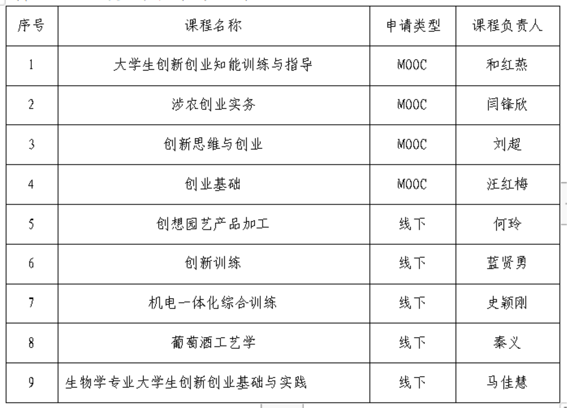 《关于公布陕西高校创新创业教育课程名单的通知》(陕教高 办〔2019〕13 号)公布的创新创业教育课程(附件1),我校课程名单如下: