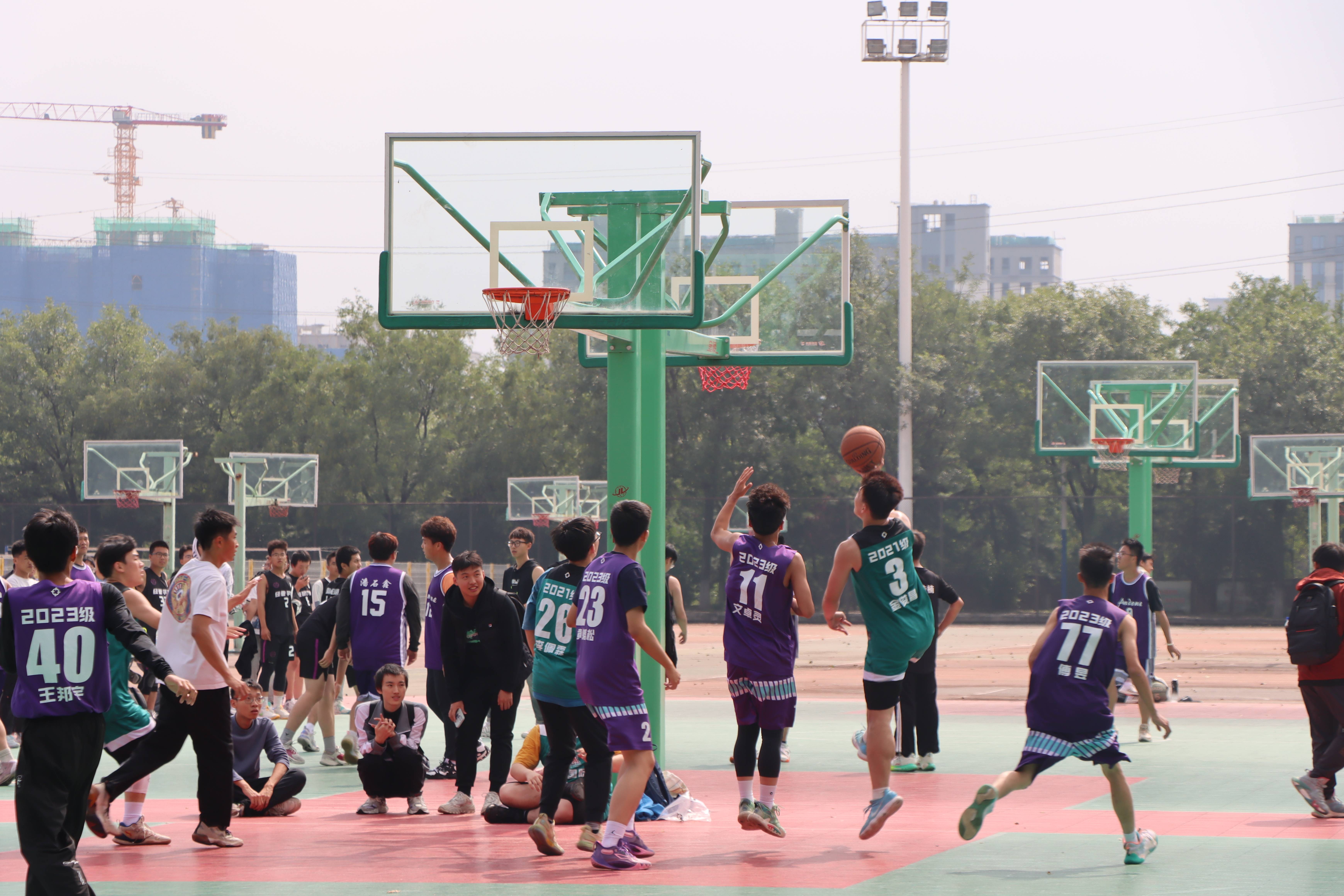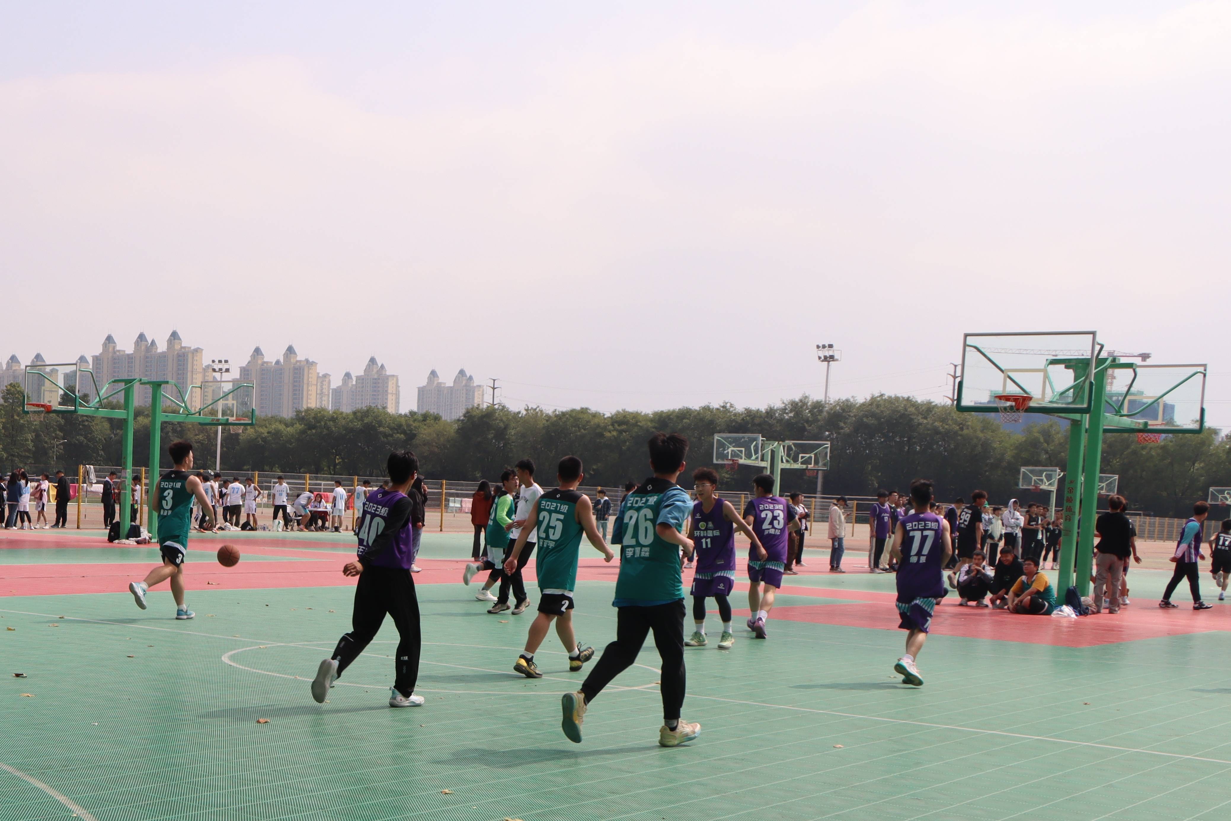 不知何时,2021级的队员以一记精准的三分将比分拉进,双方你追我赶,但比拼中也夹带着彼此的尊重与友好。