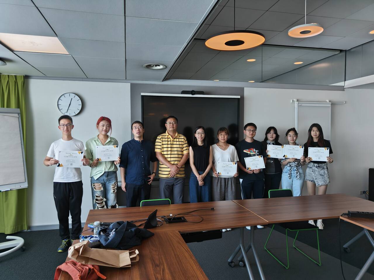 研学活动结束之际,项目组设置了四个开放性研讨课题以检验学生们的学习成果。学生们利用所学知识,结合项目背景和问题属性,经过两天调研和讨论,提出了详细解决方案,并进行了英文口头报告。答辩结果获得了TUD老师的高度赞赏。最终,TUD项目组为学生颁发了培训合格证书并举行欢送晚宴。