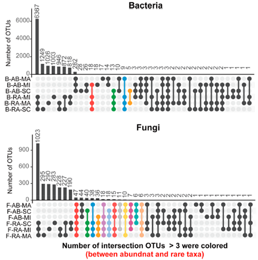 本研究基于西北农林科技大学白水苹果试验站的12年长期定位试验,调查了长期不施肥、单施化肥、生草覆盖、生草覆盖配合化肥4个处理下土壤不同粒径团聚体(> 0.25 mm;0.053-0.25 mm;< 0.053 mm)细菌和真菌群落结构,并对细菌、真菌的“丰富”和“稀有”菌群进行了群落装配分析。研究发现在丰富的细菌群落构建过程中,环境选择的重要性从大团聚体到小团聚体呈现增加的趋势。稀有细菌的群落装配过程受同质性选择影响,并且随着土壤有机碳和全氮含量的降低同质性选择的作用逐渐减弱。丰富真菌群落在团聚体中的装配过程主要受随机性过程主导,而稀有真菌群落主要受同质性选择和扩散限制共同主导。研究还发现,团聚体的发育团聚过程使丰富、稀有真菌和细菌群落结构趋于相似,但不同粒径团聚体的环境条件不同又会使其产生各自的独有菌种。而且丰富真菌、细菌可能是团聚体团聚的促进者,而稀有细菌可能是团聚体内功能的“种子库”。该研究为旱地苹果园长期生草覆盖与施肥条件下土壤肥力发育的微生物学机制提供理论依据。