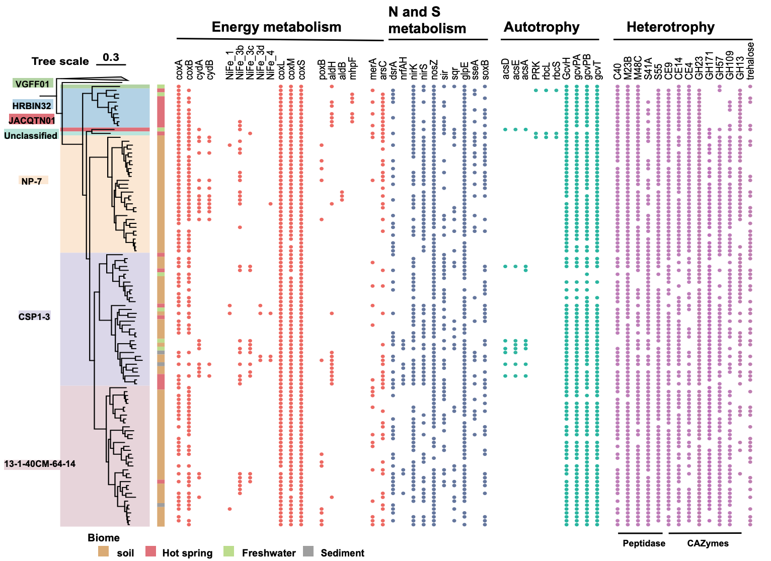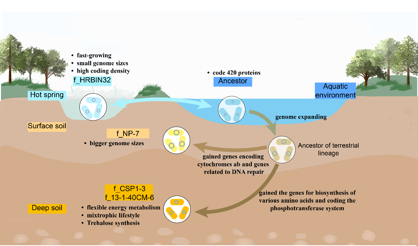 地球关键带是地球的“皮肤”,支撑着地球表面的物质循环和能量流动,在调节气候、维持生态系统健康以及支持人类活动方面发挥着至关重要的作用。研究团队采集了我国黄土高原和美国爱荷华州的深层黄土剖面,发现了深土中广泛且丰富的细菌门 CSP1-3,该细菌门在深层土壤中活跃复制,通过混合营养的生活方式以及灵活的碳源和能源获取策略来应对深土极端寡营养环境。研究揭示该细菌门起源于温泉,进化历程中呈现出基因组扩张。该细菌门在从温泉向表土和深土定殖的过程中,通过获得和丢失相关基因,实现了分类群分化,建立了对新生境的适应能力。研究结果揭示了深层地球关键带中微生物暗物质的活动和生态意义,有助于从这一鲜被研究的生境中探索生命极限和挖掘新型生物资源。