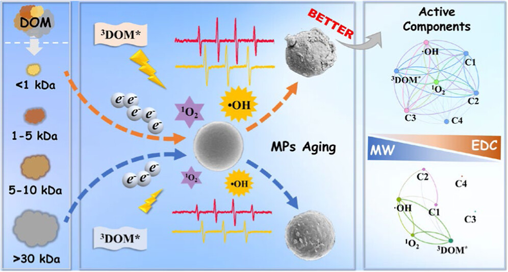 溶解性有机质作为一种具有氧化还原活性的复杂异质有机混合物,可通过吸附、结合和光敏化等多种形式与微塑料相互作用,进而影响微塑料的环境命运。其中,溶解性有机质的分子量在决定溶解性有机质介导下微塑料老化过程中扮演着重要角色,但关于溶解性有机质的分子量在该过程中的具体作用目前尚不清楚。为此,该团队探究了溶解有机质的分子量对微塑料在水环境中的光老化过程的影响与机制(图1)。结果表明:微塑料的老化在很大程度上取决于共存溶解性有机质的分子量。其中,低分子量溶解性有机质(< 1 kDa)中的高光敏荧光成分明显高于其他分子量(>30、5−30和1−5 kDa),其可通过降低光屏蔽效应、提供供电子能力和增强活性物种产生,从而显著促进了微塑料的光老化。值得注意的是,在黑暗条件下,低分子量溶解性有机质中的酚类和醌类物质可通过电子穿梭和氧化还原循环产生羟基等活性物质,促进了微塑料的老化。该研究对了解微塑料在地表中的迁移转化有更广泛的影响。此成果以“Molecular Weights of Dissolved Organic Matter Significantly Affect Photoaging of Microplastics”为题发表在Environmental Science & Technology。