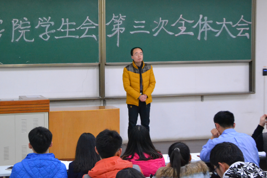 紧接着,学生会副主席李思雯与文艺部部长白云鹏对各部门进行了院元旦晚会任务的分配;体育部部长丁煜钊上台进行了越野赛动员,呼吁田径运动员发扬资环精神,再创佳绩。最后,唐帅老师对学生会各个成员的不懈努力表示感谢,并对学生会工作开展等问题发表了自己的看法。