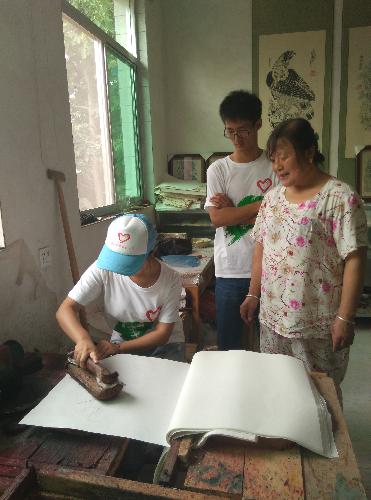 邰先生带领队员参观了他的工作室,在参观途中,邰先生为队员们进行详细的讲解。邰先生说:“通常制作木版年画所用的纸为宣纸,以便更好的涂色与保存。使用矿物颜料为年画涂色,增加颜料的二次利用率。”接下来,邰先生选取了个别作品,并为队员们讲述了其寓意。邰先生的妻子更是亲自为队员们展示了年画的制作过程。在队员们的实践过程中,邰先生对其制作过程细节部分进行特别强调并进行指导。经过一番努力,队员们都拥有了自己的处女作。