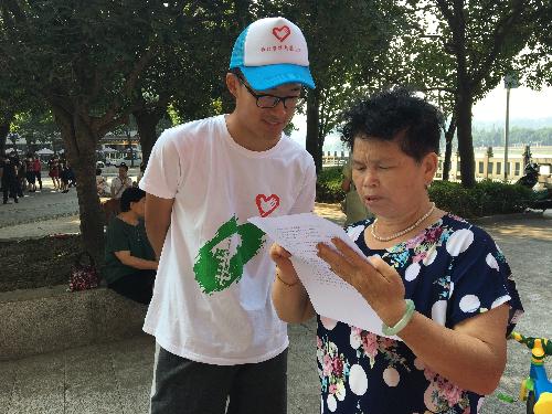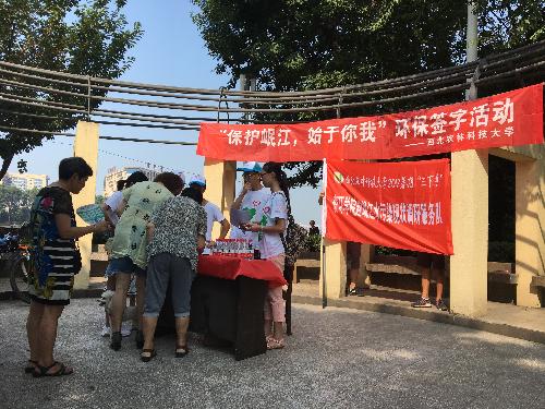 在结束17日对河流沿岸居民商户的调查走访后,18日上午,服务队在西顺河街道举办了“保护岷江,始于你我”环保签字活动,旨在了解并提高居民对水污染的关注程度和环保意识。