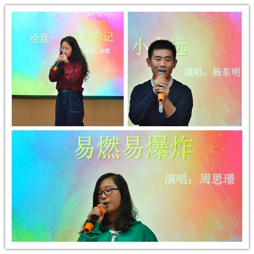 精彩激烈的角逐中,所有选手纷纷登台献艺。拉姆同学和宋秭愍同学分别带来藏语和粤语版的《喜欢你》,虽然语言不通,但同学们都被音乐所深深感染,两人别出心裁的形式和精彩的演唱也引得台下掌声连连。冯楚础和尚雨正春联袂演唱《我怀念的》,两人空灵旷达的音色萦绕着一种对过去生活的怀缅。安妮同学献上一曲《给我一个理由忘记》用自己浑厚细腻的嗓音唱出人在面对爱情消逝时的撕心之痛,情绪由收而放,渐浓渐烈,宣泄释放了积压在心底的眼泪。陈旭阳的《冰雨》用真挚饱满的情绪、深沉的演唱致敬经典,自备的雨伞道具也将同学们引入歌曲的情境之中。高虎同学演唱的《慢慢》,一气呵成的起承转合,至悲至情的动情演绎,令人回味无穷。周思璟同学的《易燃易爆炸》极具戏剧冲突感的歌词,配合她发泄式的唱法,令人听来畅快淋漓。周雪彤的《Someone Like You》用内心的声音唱出了对过往生活的释怀,对曾经爱过的人的祝福。杨东明的《小永远》让人感受到了爱情的浪漫与幸福,不仅赢得了大家的掌声,也赢得了评委老师的赞美。