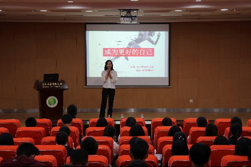 报告会上,石美老师就“如何度过刚上大学的迷茫期”这一问题展开报告内容,点明迷茫的原因是没有明确的目标。之后提出设想场景:大学四年后想遇到什么样的自己,并给出继续深造、求职就业、自主创业以及其他四个方向。她强调:不论选择什么方向,在选择之前都要先了解自己的选择,考虑自己在这方面有什么样的核心竞争力。继续深造方面,有两个选择,一是读研究生,二是出国深造。选择继续深造的同学们除了应该有过硬的专业知识,还要掌握一定的操作能力,石老师引用了由农转工的优秀学生以及在中科院研究出纳米防菌口罩的中学生大宝两个例子阐释了要对科研要耐得住寂寞,保持一定的激情的重要性。就业求职方面石美老师援例引据,通过讲述计算机专业同学自创教育机构与在百度任职的例子展示出就业求职应有的品质。