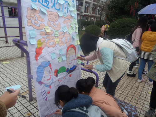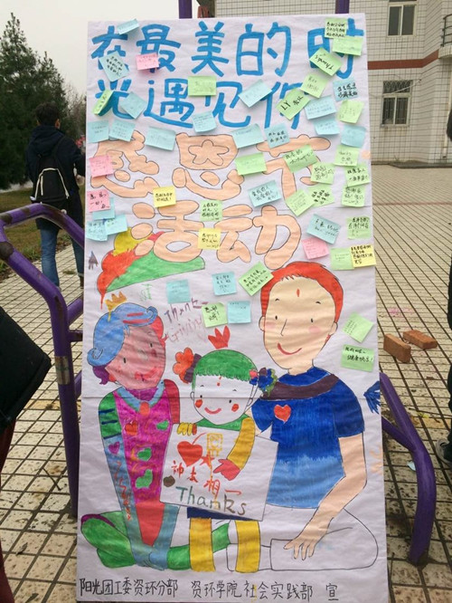本次感恩节活动分为“感谢你,我爱的人”“Thanks To The World”“心怀感恩,绘出梦想”三部分。活动中,同学们积极的在条幅上签名,表达自己的感恩之心。宣传板也是此次活动的一大亮点,参加活动的同学们积极的为图画涂上了绚丽的色彩,同时在画板上贴满写着祝福的便利贴,便利贴随风飘动就像一只只载满爱的信鸽飞向远方的亲人,在冬季的校园里刮起了一阵温暖的感恩之风。