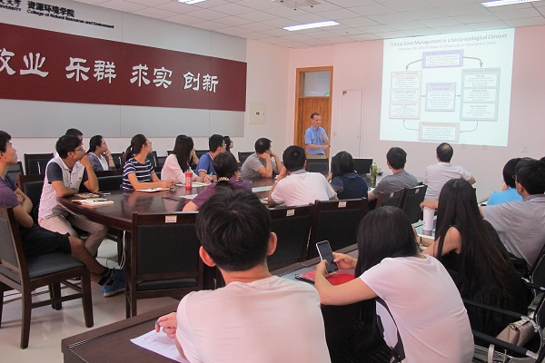 在访问期间,Tyson Ochsner博士在伟德体育官网作了题为“Facilitating sustainable management of the Earth's Critical Zone: The role of soil moisture science and technology”的学术报告。Tyson Ochsner博士以美国俄克拉何马州为例,利用宇宙射线中子流动站来了解土壤水分空间变异的推动力。同时结合土壤水分观测站、气象雷达及卫星遥感等一系列手段制作具有高分辨率的全州土壤含水量分布图,每天进行更新发布。此外,还开发了可以预测特定地点和管理条件下的土壤水分的工具。介绍了合理利用土壤水资源,提高火灾预警能力及地下水补给等提供理论基础和决策支持的科学观点。报告会现场气氛活跃,与会者纷纷表示深受启发,并就自己感兴趣的问题与Tyson Ochsner博士进行了深入的交流和讨论。