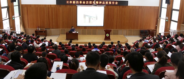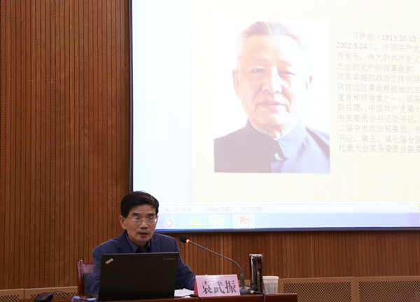 袁武振教授从接受革命思想、创建陕甘宁革命根据地、保卫陕甘宁边区、解放大西北、主政西北、“国务院大管家”、主政广东创办经济特区、推进新时期党的建设、统一战线和民族宗教工作、注重家教家风等十多个方面,以详实的史料、生动的语言,讲述了中国共产党的优秀党员、伟大的共产主义战士、杰出的无产阶级革命家习仲勋89年的光辉岁月、76年的革命历程和他对中国革命建设及改革开放的巨大贡献,高度评价了习仲勋同志的革命精神和高尚品质。他讲到,在新的历史时期,我们全党开展“两学一做”学习教育,应进一步学习、继承和弘扬习仲勋的革命精神,学习他坚定理想信念不动摇的高尚品格,学习他实事求是的工作作风,学习他一心为民的赤子情怀,学习他胸怀坦荡、光明磊落的崇高风范。