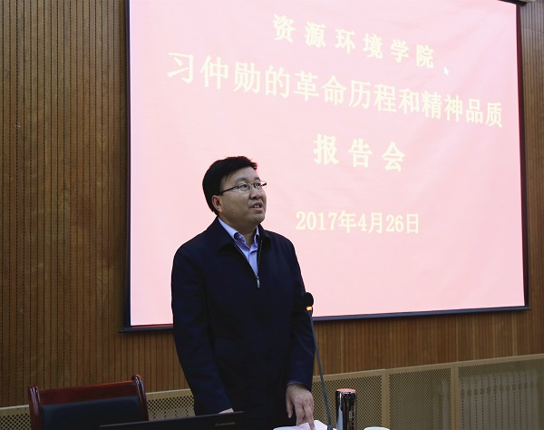 4月26日下午,西安邮电大学马克思主义学院院长、党委宣传部部长、中共党史研究专家袁武振教授应邀来我校,在资环学院报告厅为师生作了题为“习仲勋的革命历程和精神品质”的报告。我院在校全体教职工和学生党员、党员发展对象、入党积极分子等200余人聆听了报告。报告会由学院党委书记闫德忠主持。
