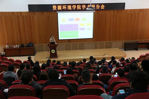 Ashok Pandey博士作了题为“W-2-W: Biomass-Based Biorefinery for Fuels and Chemicals”的学术报告。报告中他详细介绍了印度科学与工业研究理事会毒理研究所厌氧发酵处理生物质原料来实现资源化利用有机固体废物的相关技术及工艺流程,并分析了目前存在的技术难点。会上Pandey博士以当前印度企业利用生物材料制备乙醇和琥珀酸等副产物为例介绍了生物质能以及化学品的资源利用途径,从实验室的科学研究和企业工业生产两个方面分析了厌氧发酵处理生物质的能源回用技术,并介绍了目前印度生物质能科研应用的研究进展和发展方向。报告会后,与会师生就厌氧发酵过程中生物质燃料、生物炭前瞻性应用发展等相关问题进行了热烈交流,并取得了良好效果。