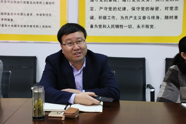 闫德忠首先向宋西德一行介绍了伟德体育官网党员队伍、党委班子组织机构、教工和学生党支部设置特点等情况,以及校、处、院级党员领导干部对接联系教工党支部的工作开展情况。他重点围绕“履行党建责任,助推学院发展”主题,分享了学院党委在推进“两学一做”常态化制度化中,注重问题导向,在全覆盖、重创新、求实效上所做的系列工作。学院党委贯彻落实全面从严治党,严格党员教育管理,狠抓政治理论学习,实行“六学”,建设“五型”党组织,本科生水保支部党员9年坚持“青春点亮夕阳红”,开展“迎新党员义务服务队”、“研究生党员先锋工程”、“讲党课比赛”、固定党费收缴日等系列特色主题活动,取得了显著成效。党委履行党建主体责任,坚持党政协力,统筹兼顾,围绕学院发展大局,做好人才引进、“十三五规划”制定、切实解决教职工关心的系列问题;全面贯彻全国高校思想政治会议精神,落实立德树人根本任务,加强师生的政治思想引领,引导教职工树立正确的价值观,重视教学工作,全力做好学科评估、本科教学审核评估任务整改;加强纪律和学风建设,促进大学生全面成长成才;加强招生宣传和学生就业工作并取得了可喜成绩。严格执行每周三下午的政治理论学习制度,每月举行一次“资环讲堂”报告会,得到广大师生良好反响,全院形成向好向上的政治生态,全面助推学院发展。