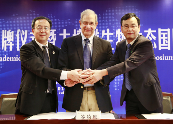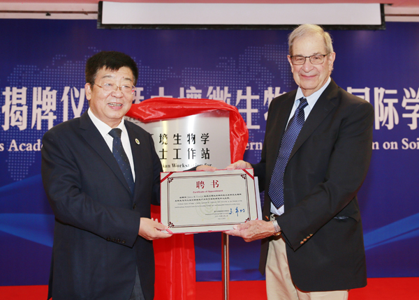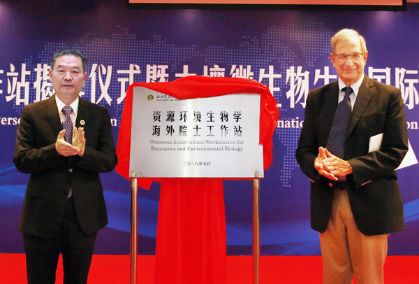校党委书记李兴旺和詹姆士•迪杰院士为资源环境生物学海外院士工作站揭牌
