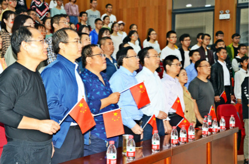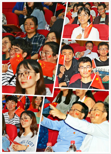10月1日,学院师生集体在学院学术报告厅观看新中国成立70周年庆祝活动。到场师生每个人脸上贴着小红旗,手拿小红旗不停摇动,一直沉浸在普天同庆的喜悦中。