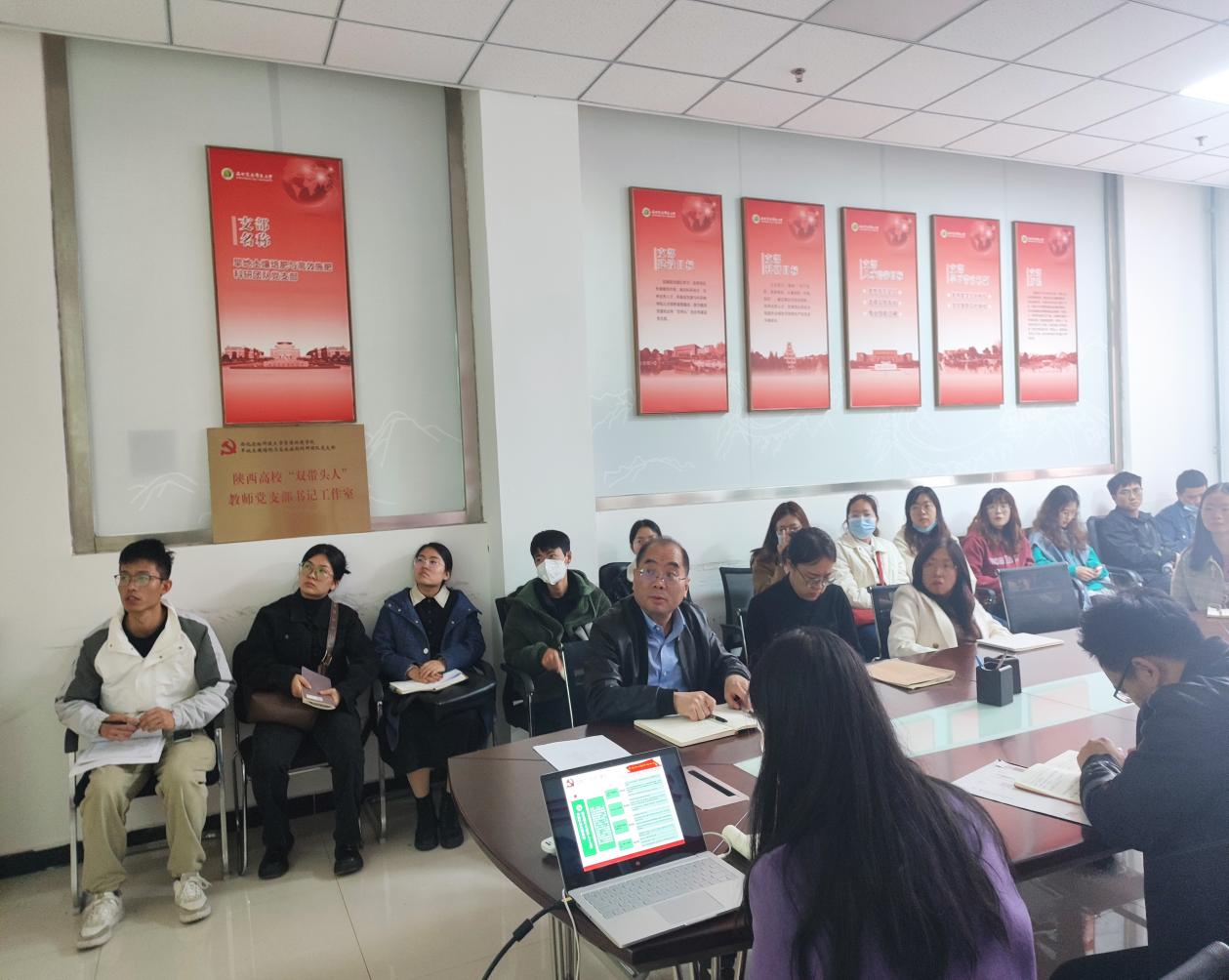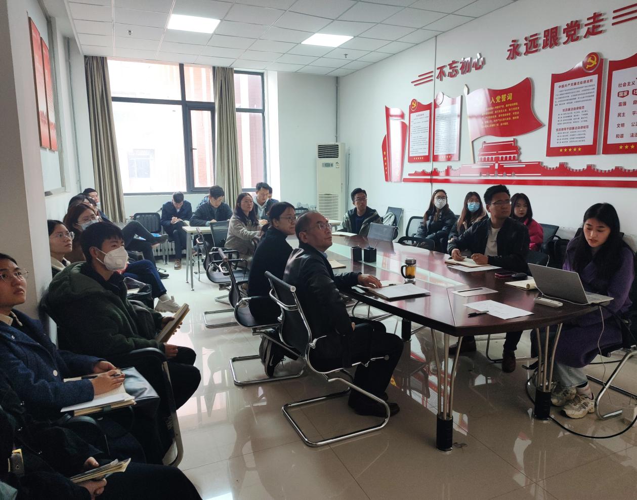 随后支部书记翟丙年做了总结发言,就报告中的提到的“科教兴国战略”、“ 全面从严治党”、“增进民生福祉”等方面,结合亲身体会,深入浅出地讲述了这十年来党带领人民进行的伟大自我革命和取得的伟大成就。翟老师说道:“过去乡村中家族势力盛行,村委会职能被极度削弱,而在这几年的扫黑除恶中,此类现象已被彻底消除,这充分体现了党勇于自我革命,敢于斗争的精神”。会上,翟老师还从选举的新一届国家领导人集体赴延安考察调研,参观苹果园等时政新闻,结合我们自身专业,为我们了讲述这次领导人赴延安考察的深渊意义。并勉励支部成员发扬“延安精神”,增强自身研究方向的信心。进一步将学习党的二十大精神落到实处。