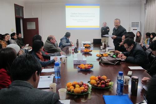 7日晚19点30分在我院第一会议室,美国西弗吉尼亚大学植物与土壤科学系Louis McDonald教授为我院师生作了“Carbon Sequestration in Mine Soils Chronosequence”和“Poultry Litter and Mine Soil Reclamation”两个专题报告。Louis McDonald教授从土壤碳库在减缓气候变化的重要作用出发,详细的介绍了他们对矿区土壤复垦过程中土壤有机碳库积累,包括如何采样,样品数的确定以及对样品的分析等方面。而有关对矿区土壤的修复,Louis McDonald教授研究利用Biochar 施用对矿区土壤的影响。激起了与会师生的广大兴趣,就Biochar的含碳量以及对矿区土壤的修复效果以及Biochar的制备过程进行了热烈的讨论。