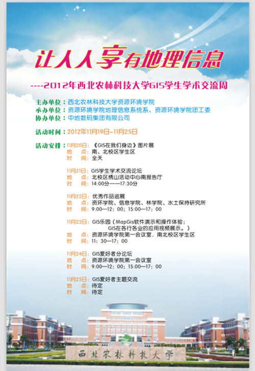 据悉,本次GIS学生学术交流周活动将面向全校学生征集GIS相关开发和应用作品,举办优秀作品巡展;举办《GIS在我们身边》图片展,发起以MapGis软件演示和操作体验、应用视频展示为主体的GIS乐园活动,举办GIS爱好者分论坛和主题交流活动。