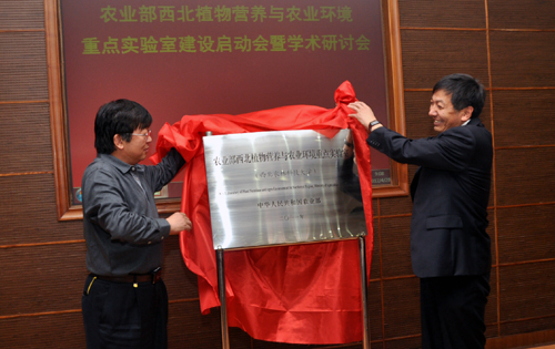 副校长吴普特和“农业部植物营养与肥料综合实验室”副主任白由路(右)为实验室揭牌