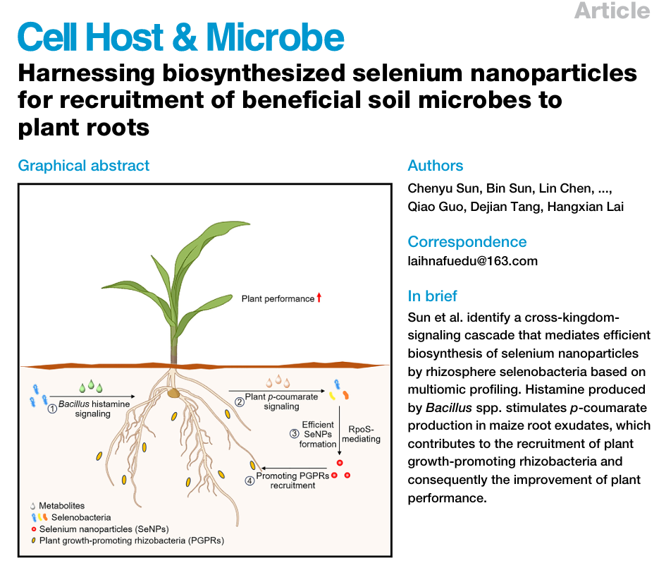 近日,来航线教授团队在植物-微生物互作方向取得新的进展,研究成果以“Harnessing biosynthesized selenium nanoparticles for recruitment of beneficial soil microbes to plant roots”为题在Cell子刊《Cell Host & Microbe》(IF2023 = 30.3)上发表。伟德体育官网博士研究生孙晨瑜、硕士研究生孙斌和西北大学青年教师陈林为共同第一作者,来航线教授为通讯作者,我校为第一和通讯单位。