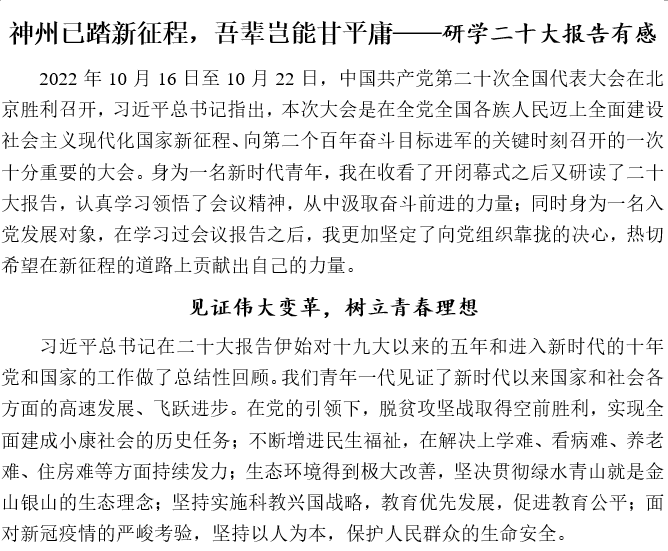 【研学二十大 争做新青年】在党支部的号召下,各党小组开展了“研学二十大,争做新青年”为主题的组织生活会,通过采取观看学习、重点研讨、线上交流等形式组织学习,小组成员认真学习了党的二十大提出的新思想、新判断和新部署、新要求,从党的二十大精神中汲取思想伟力,并交流分享学习感想。“青年强,则国家强。当代中国青年生逢其时,施展才干的舞台无比广阔,实现梦想的前景无比光明。”习近平总书记的殷切寄语,令人倍感振奋。“作为一名青年党员,我深感使命光荣、责任重大,我将在自己的专业研究领域脚踏实地,努力成为有理想、敢担当、能吃苦、肯奋斗的新时代好青年。”第二党小组成员王梦情分享了学习心得。