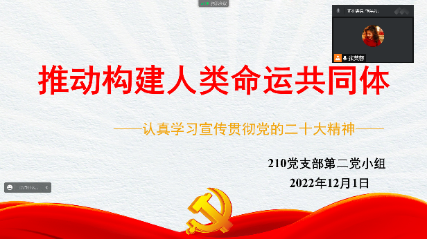 【深入学习“推动构建人类命运共同体”】11月30日,党支部书记董昭芸带领全体党员从推动构建人类命运共同体的角度深入学习了二十大精神。支部全体党员观看学习了中国国际问题研究院院长徐步对党的二十大报告关于人类命运共同体理念的相关问题解读的专访视频,深入领悟了人类命运共同体理念的内在涵义。中国的发展离不开世界,世界的发展离不开中国,中国的前途命运日益紧密地同世界的前途命运联系在一起。人类命运共同体理念顺应时代的潮流,为人类社会指明了前进方向,指明了光明的未来。支部党员在此次学习中进一步了解了人类命运共同体这一重要理念,并且坚定了日后为中国的和平发展、世界的繁荣进步贡献一份自己力量的决心。