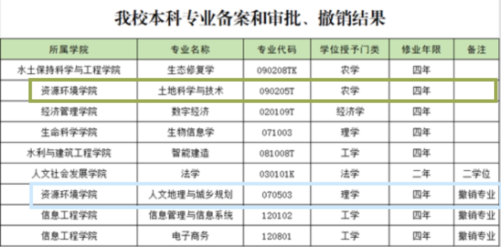 近日,教育部公布了2024年度普通高等学校本科专业备案和审批结果,我院申报的土地科学与技术本科专业获批。全校共获批5个本科专业和1个第二学士学位专业(法学);同时撤销3个专业,其中包括我院的人文地理与城乡规划专业。