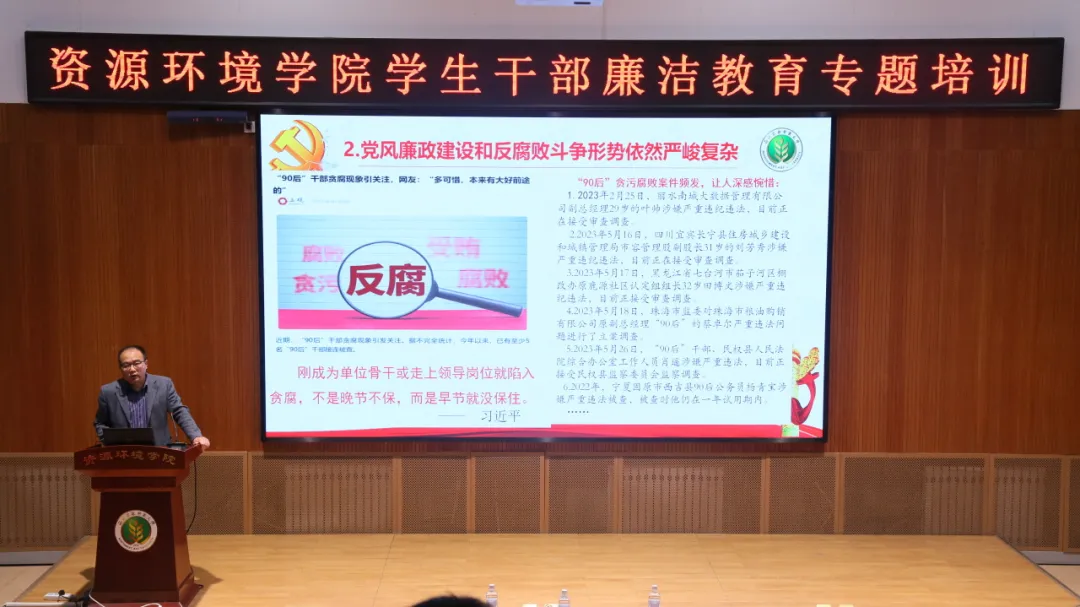 田长河老师围绕新时代学生干部廉洁教育的核心内容,进行了深入浅出的讲解。首先,他强调,作为新时代的青年学生干部,必须树立正确的观念,树立为师生服务的正确理念,强化奉献精神和以身作则的榜样意识,去除官僚化、功利化、庸俗化的思想,做出积极表率。同时,田长河老师结合具体案例,深入剖析了学生干部中出现的“微腐败”行为和作风问题。除此之外,他激励学生干部们要坚定理想信念,锐意进取,练就兴农本领,保持忠诚之心扎根基层,弘扬西农精神,让青春在乡村振兴的舞台上熠熠生辉。